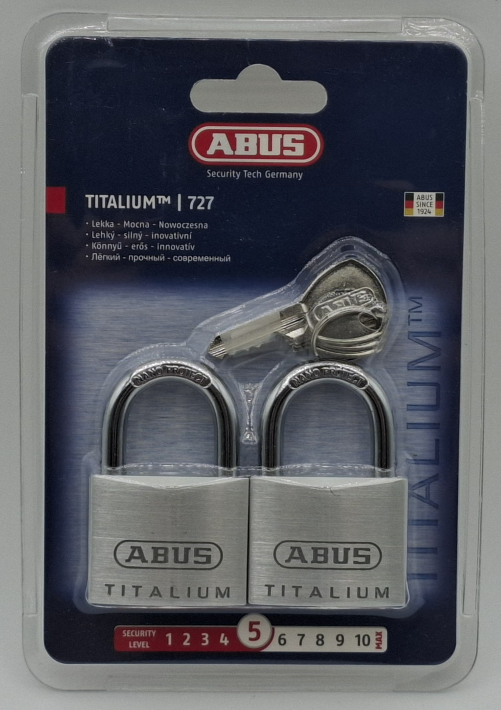2 db azonos kulccsal működő Abus Titalium 40 mm-es lakat 3 db kulccsal. A hozzátartozó 3 db kulcs mind a két lakatot nyitja. A lakatok alumínium ötvözet testüknek köszönhetően kültéren az időjárás viszontagságainak kitéve is használhatóak.